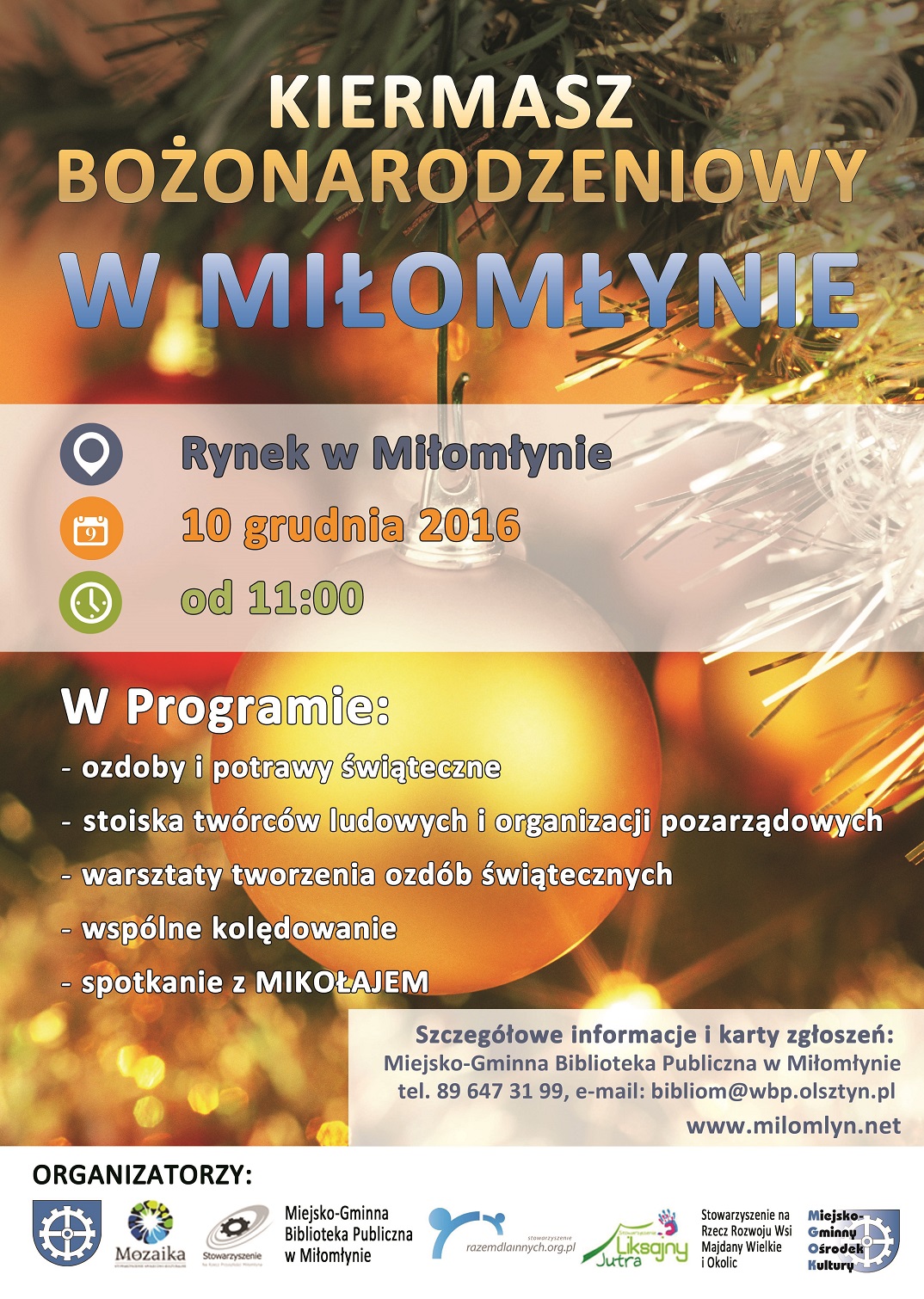 Serdecznie zapraszamy do udziału w jarmarku bożonarodzeniowym, który odbędzie się 10 grudnia (sobota) na rynku w Miłomłynie. Start o godz. 11:00.